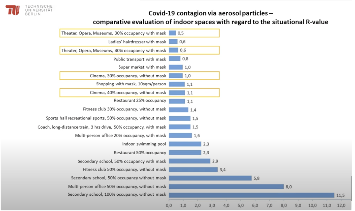 - Una investigación publicada en febrero de 2021 por la Universidad Técnica de Berlín comparó las partículas de aerosol que contenían el virus y evaluaron el riesgo de infección dependiendo del tipo de ubicación en zonas interiores. Los investigadores compararon el número de reproducción, o el llamado valor R, con o sin mascarillas y teniendo en cuenta diferentes límites de ocupación. La conclusión clave de la investigación fue que el valor R era más bajo en espacios culturales (como cines, teatros o museos) que en restaurantes, aulas u oficinas.